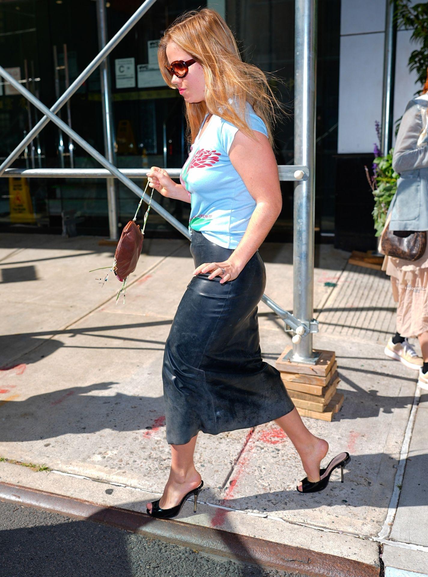 Addison Rae was seen cruisin’ around New York, rockin’ a chill light blue t-shirt with a slick leather midi skirt, toppin’ it off with heels and a tiny bag.