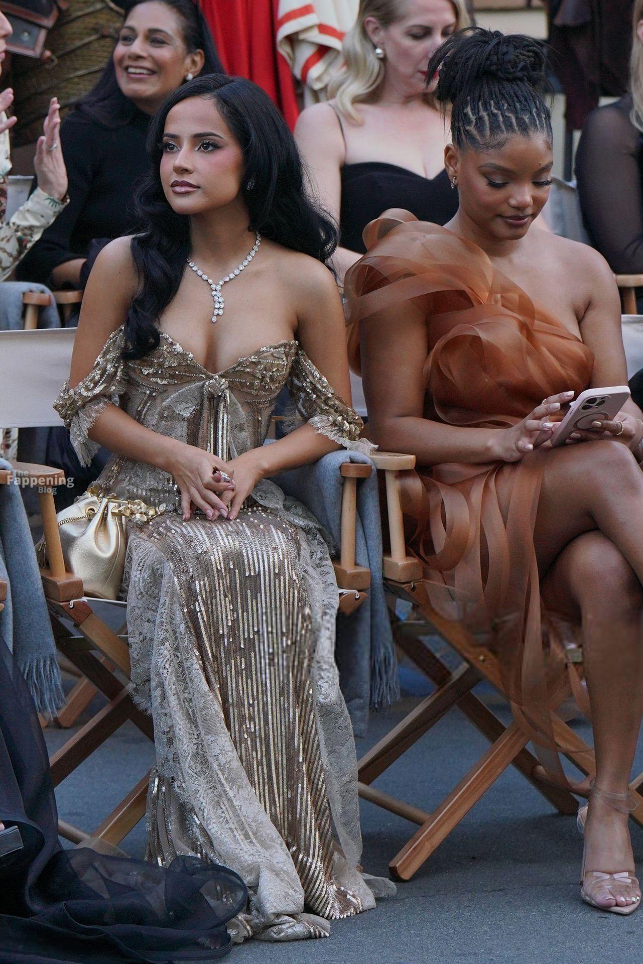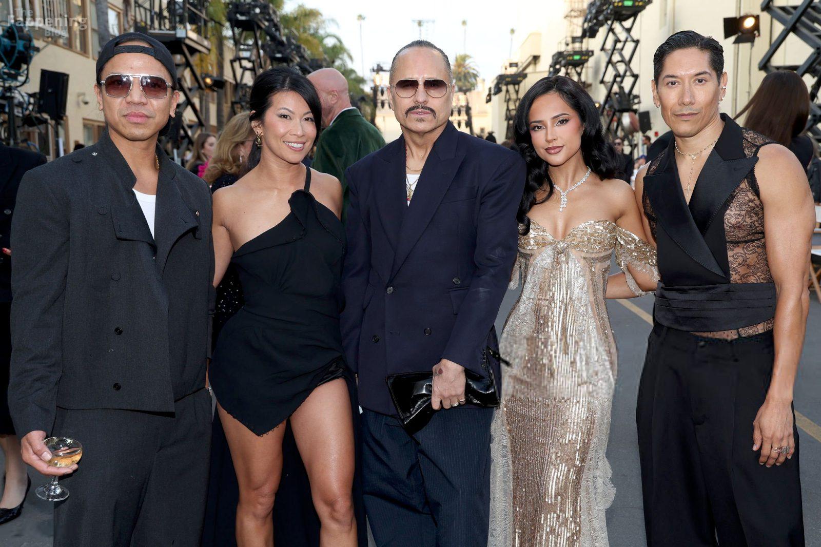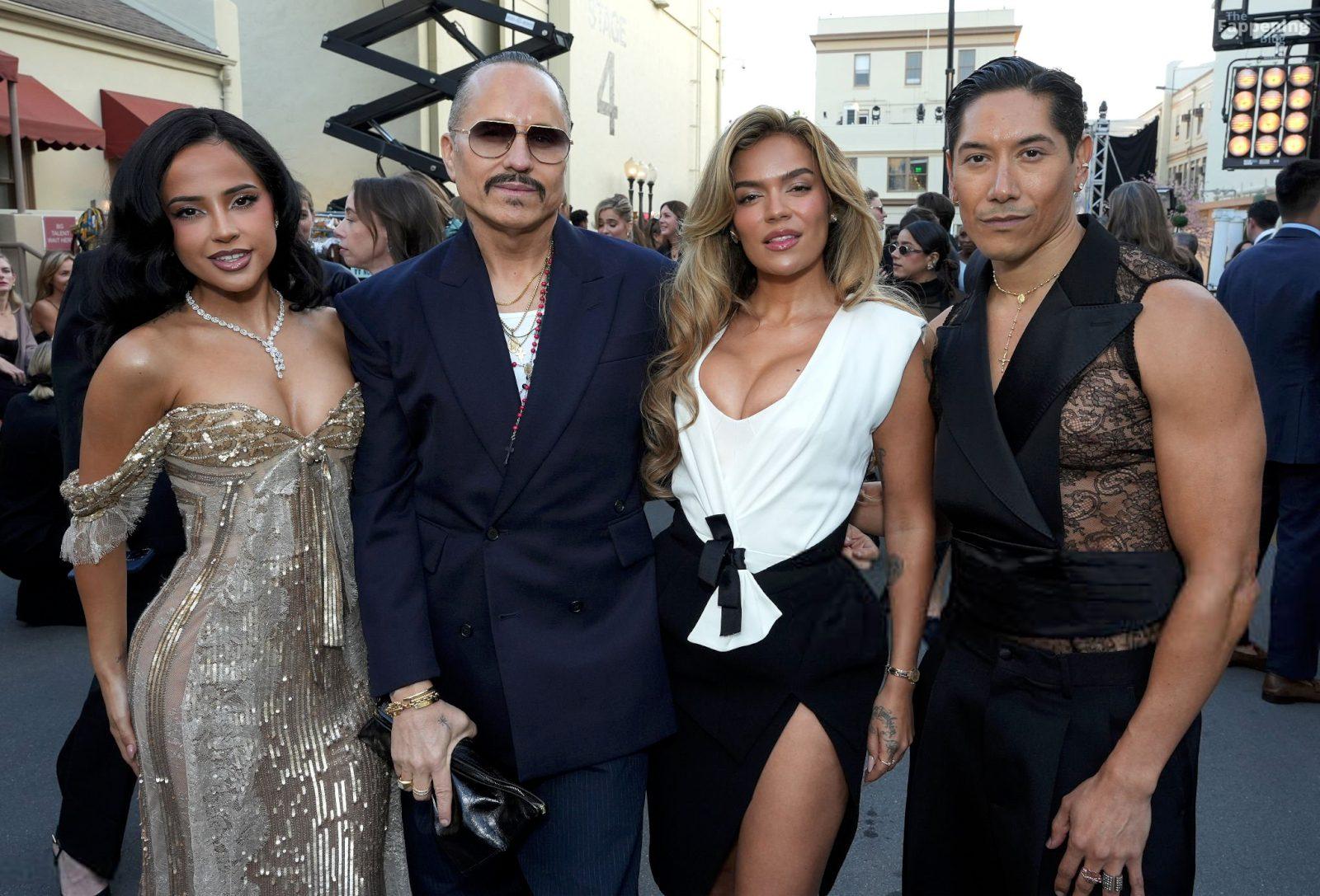 Singer Becky G shows off her cleavage wearin’ a gold sequin gown at Vogue World: Hollywood 2025.