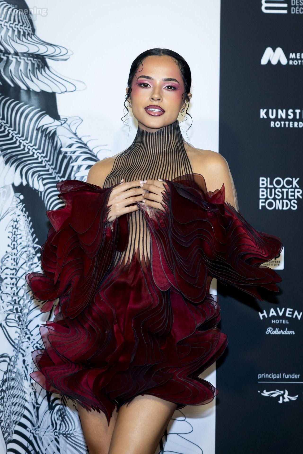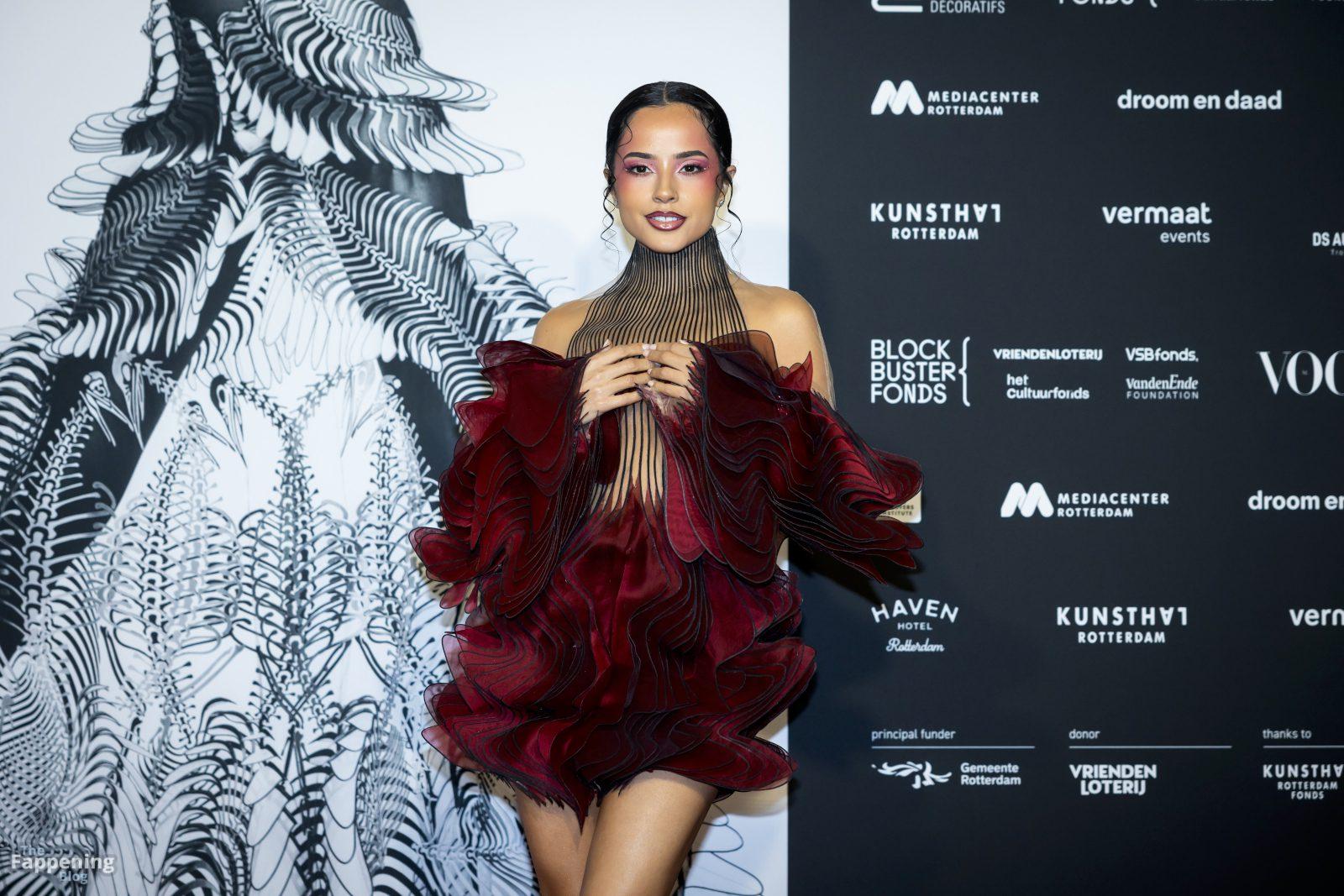 Becky G showed it all in Rotterdam, rockin’ a sheer illusion dress that flashed her sexy tits and toned legs at the Iris van Herpen exhibition.