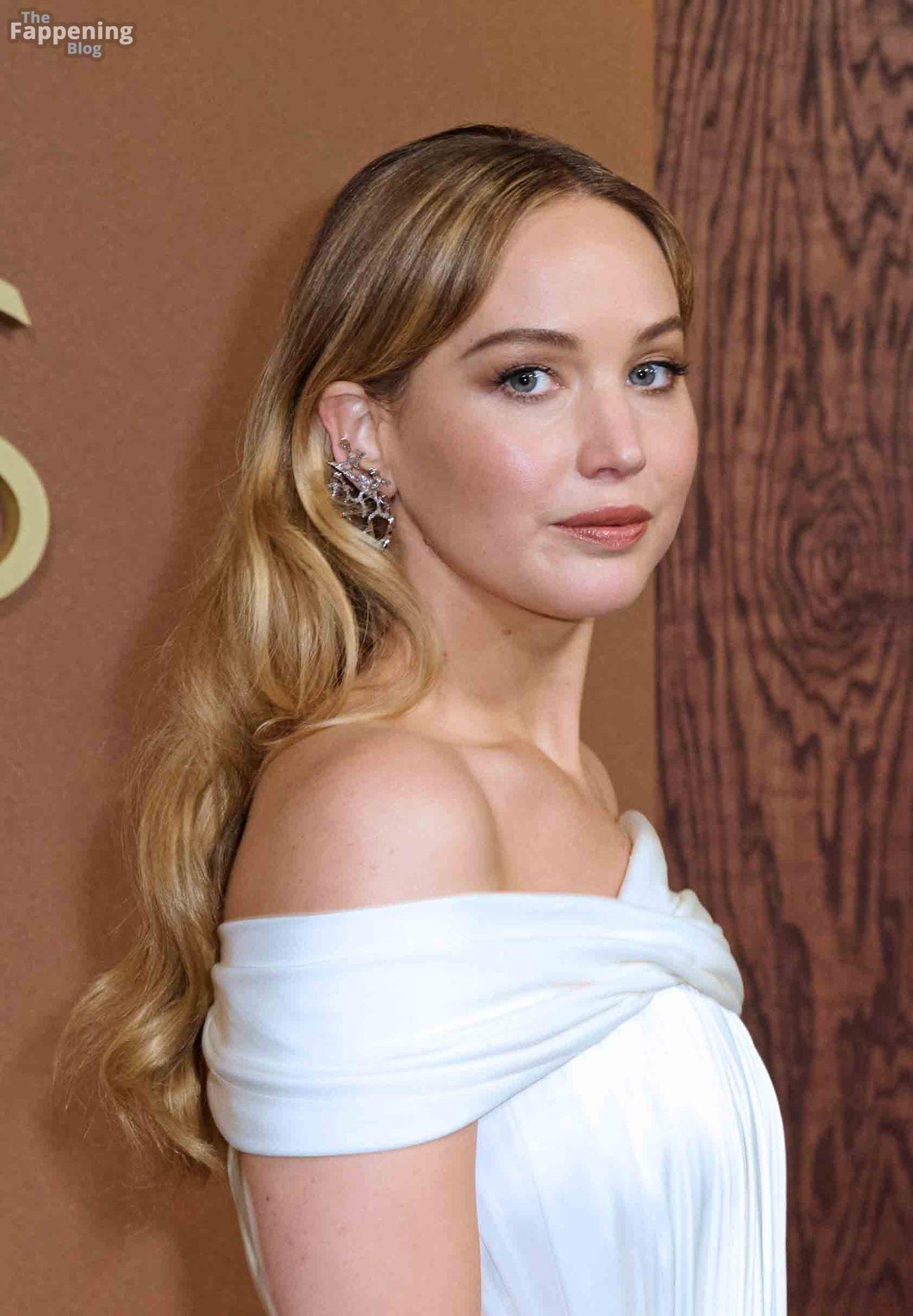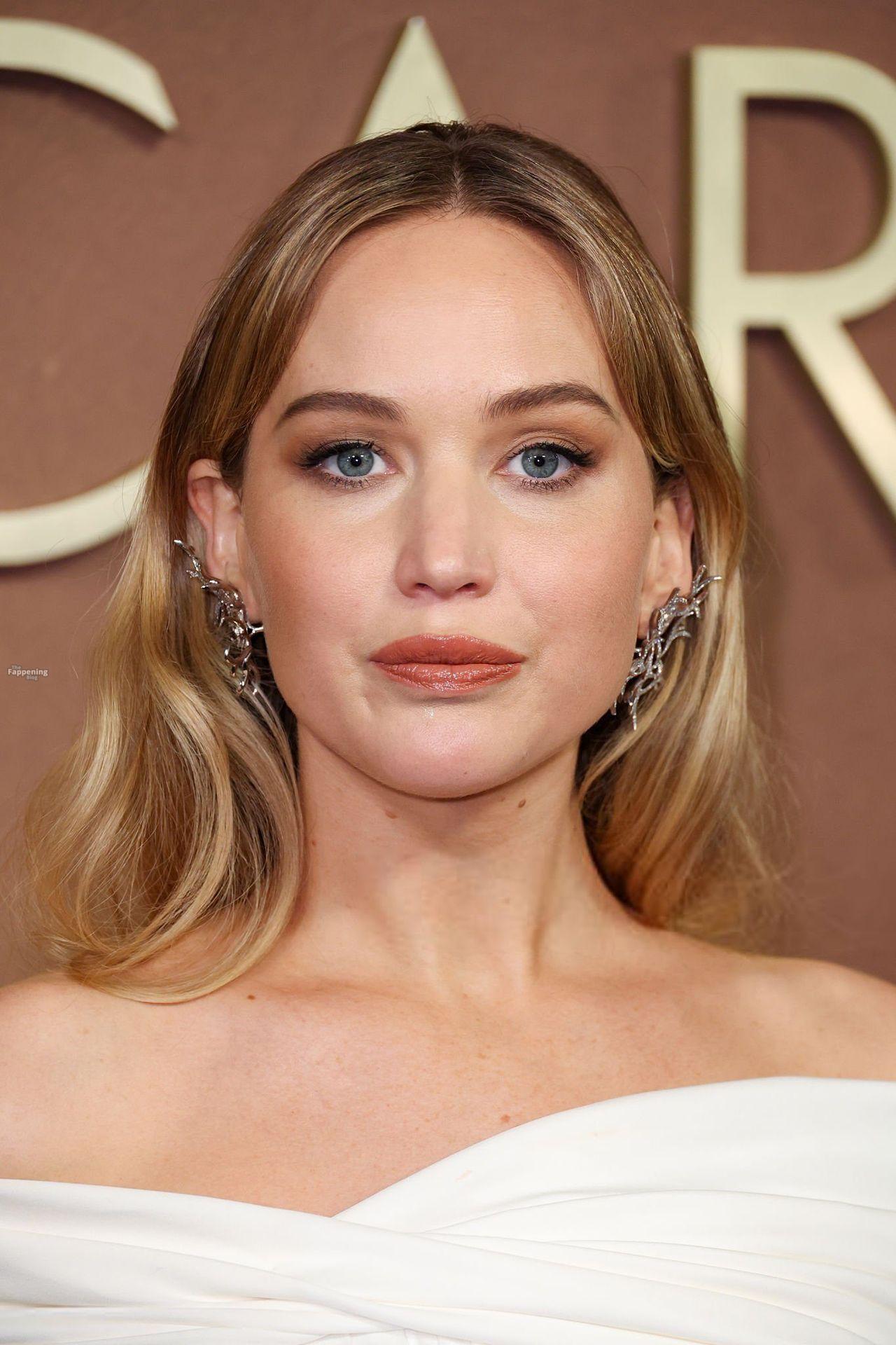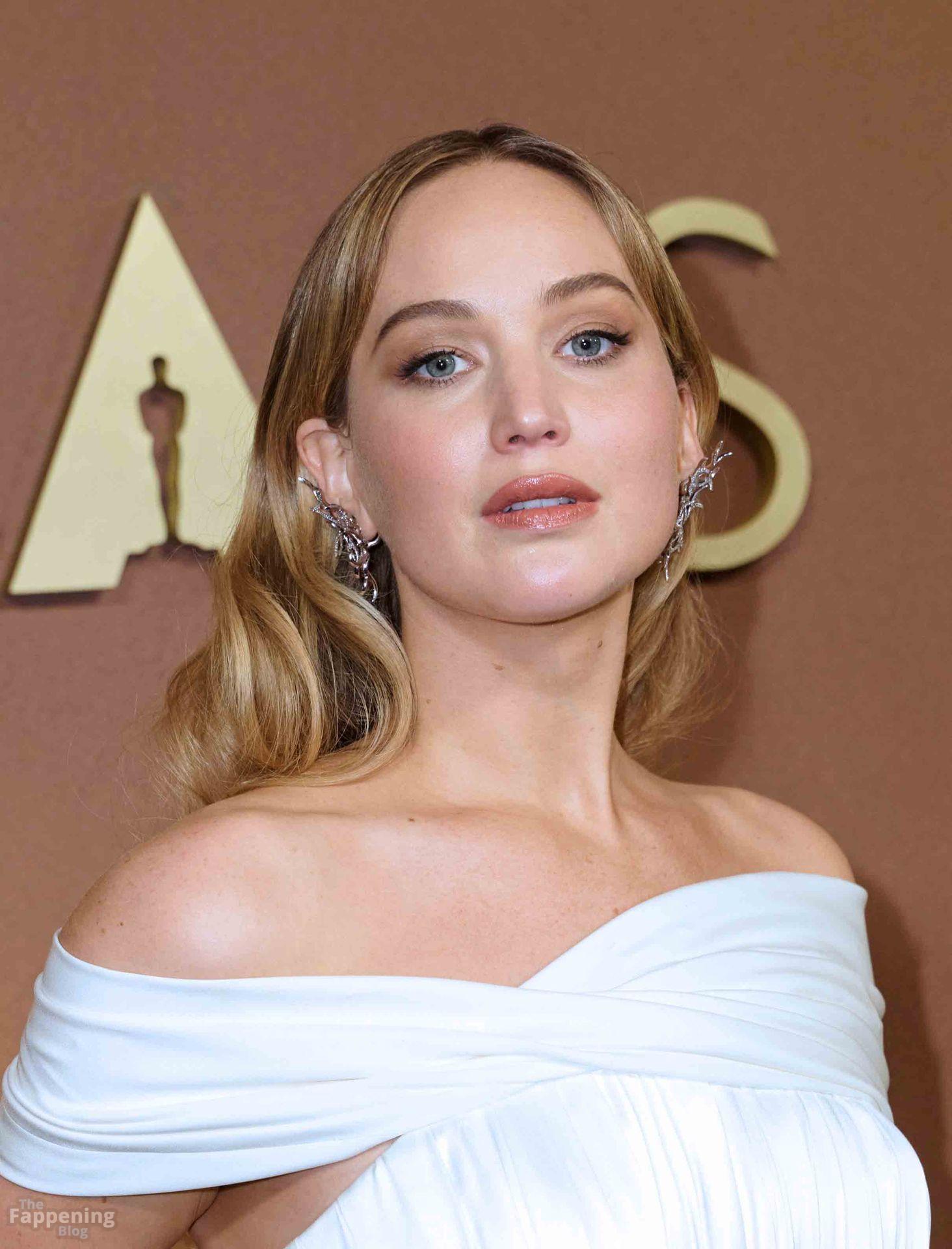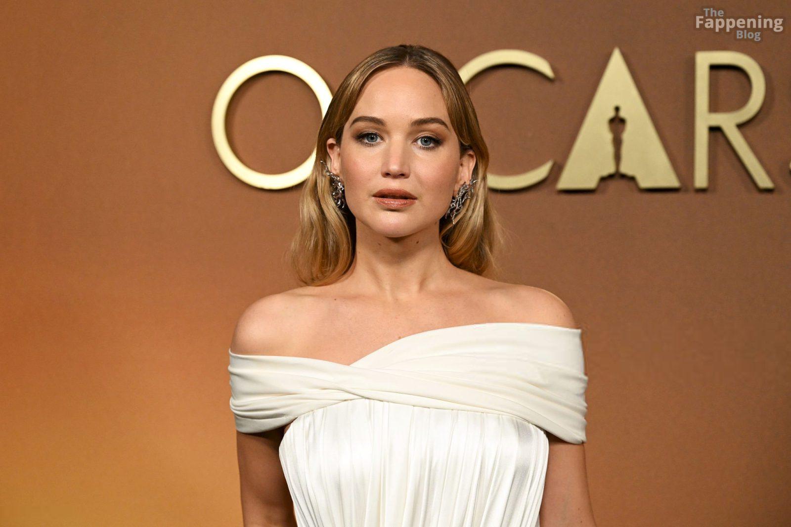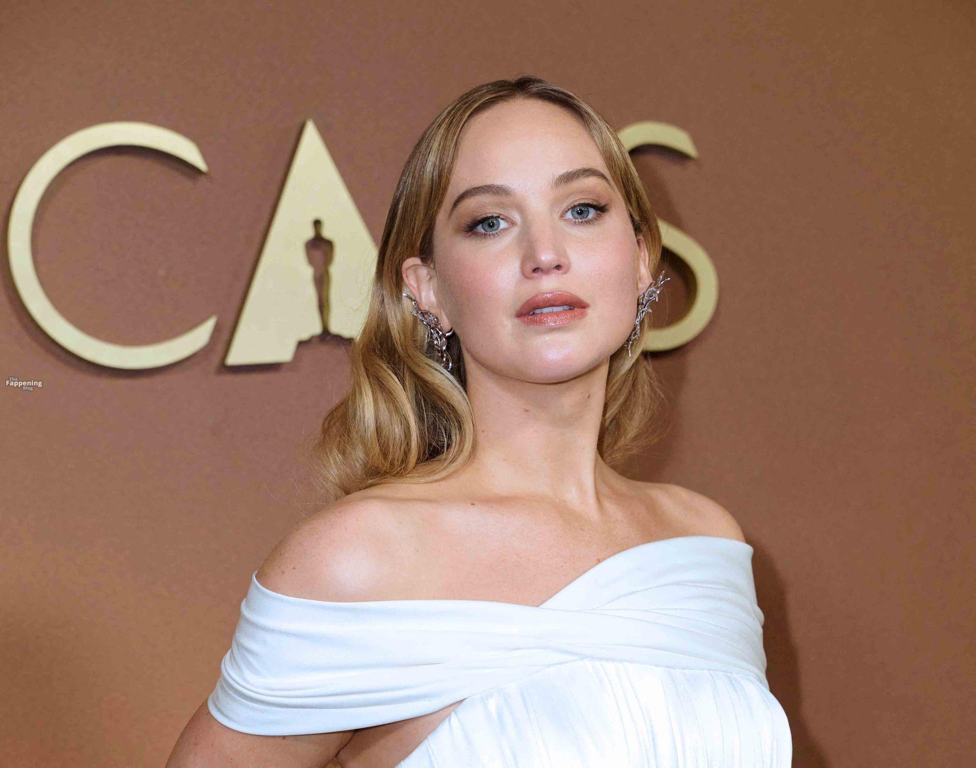 Jennifer Lawrence stuns in a white off-shoulder gown with a thigh-high slit at the 16th Governors Awards at Ovation Hollywood in Los Angeles.