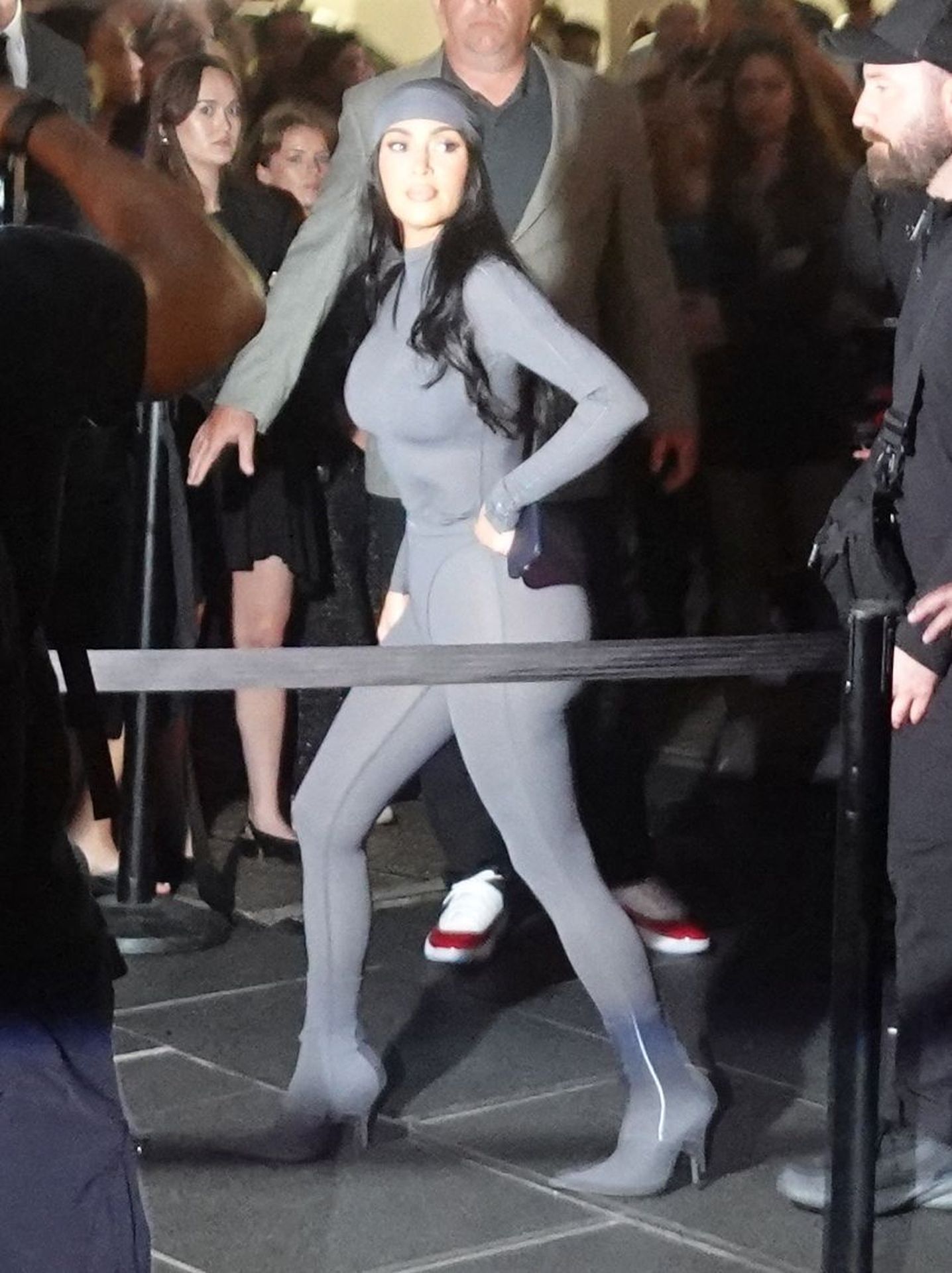 Kim Kardashian showed off her goods in a see-through gray catsuit at the Nike x SKIMS Bodies At Work NYC launch. She hit up the launch event at Nike House of Innovation in New York City.