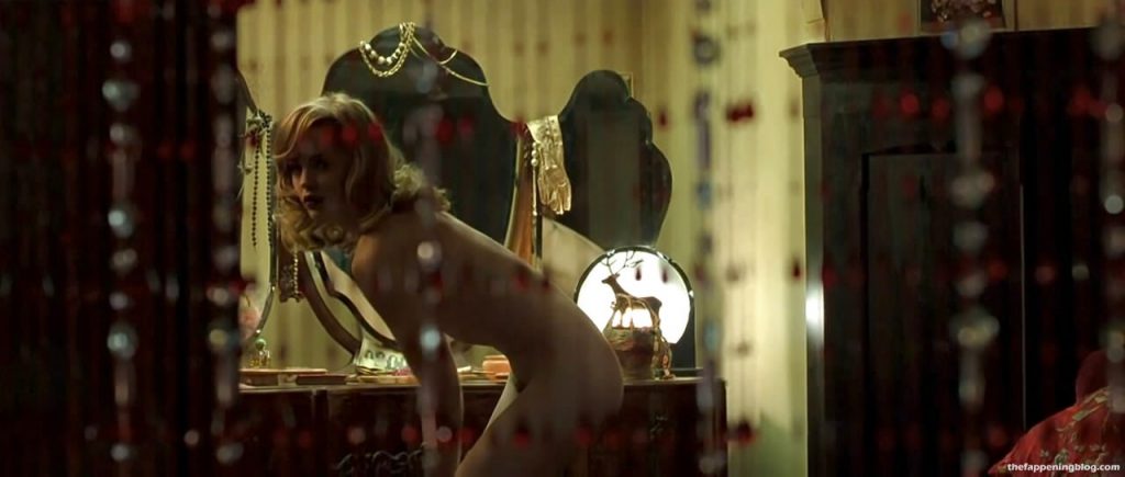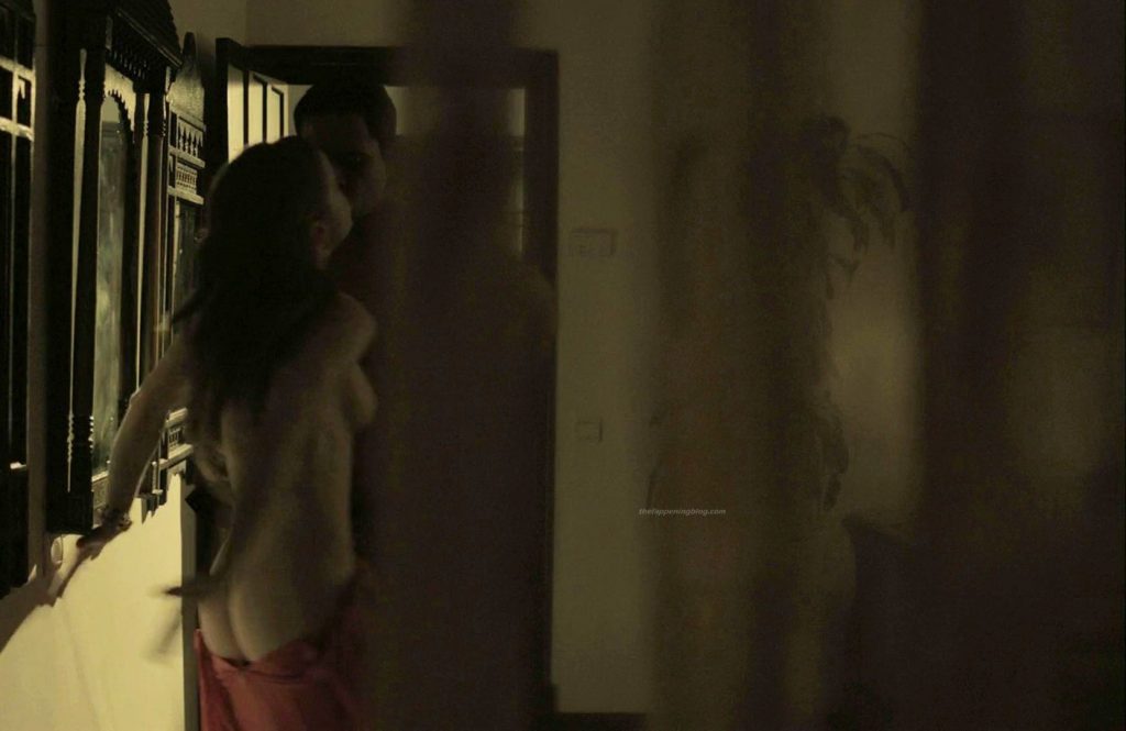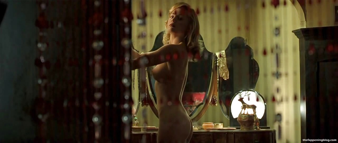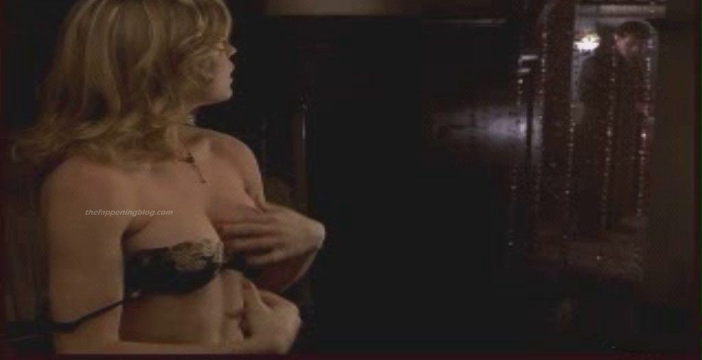 Melissa George is making out with a guy in a hallway as they undress each other, Melissa showing her bare butt and then her breasts as her dress falls to the ground and she has sex with the guy against the wall.