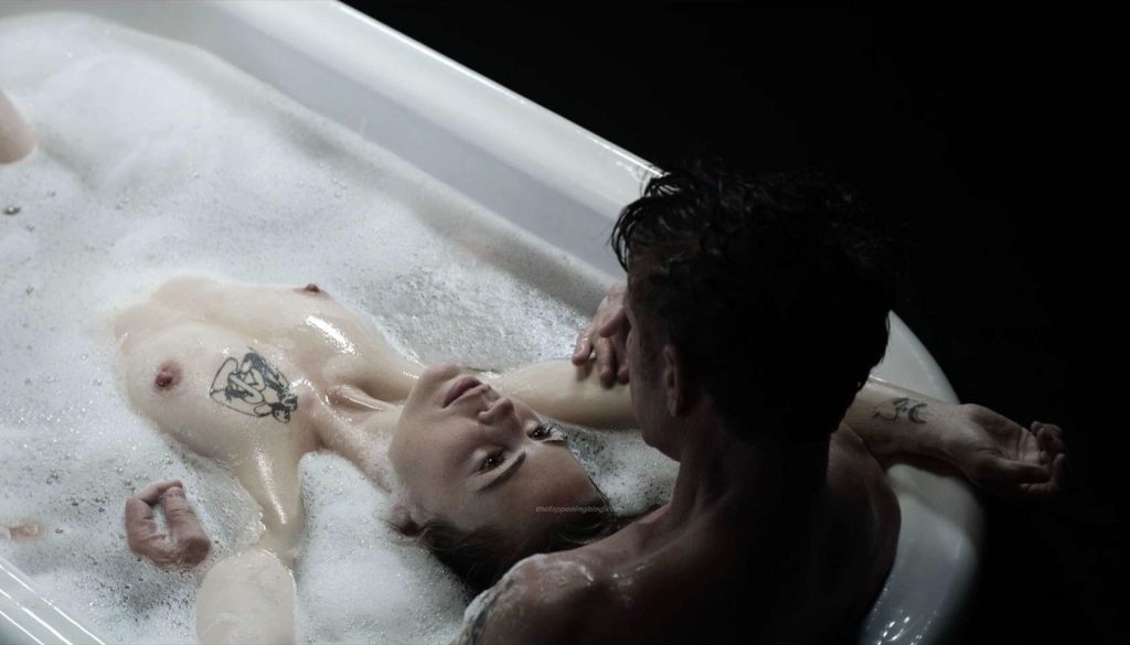 Melissa George is naked in a bath tub, showing bare breasts above the water while reclining against the back of the tub. A guy then enters the room and Melissa gets out of the tub, showing plenty more of her breasts as she stands in front of a mirror with a towel wrapped around her waist.