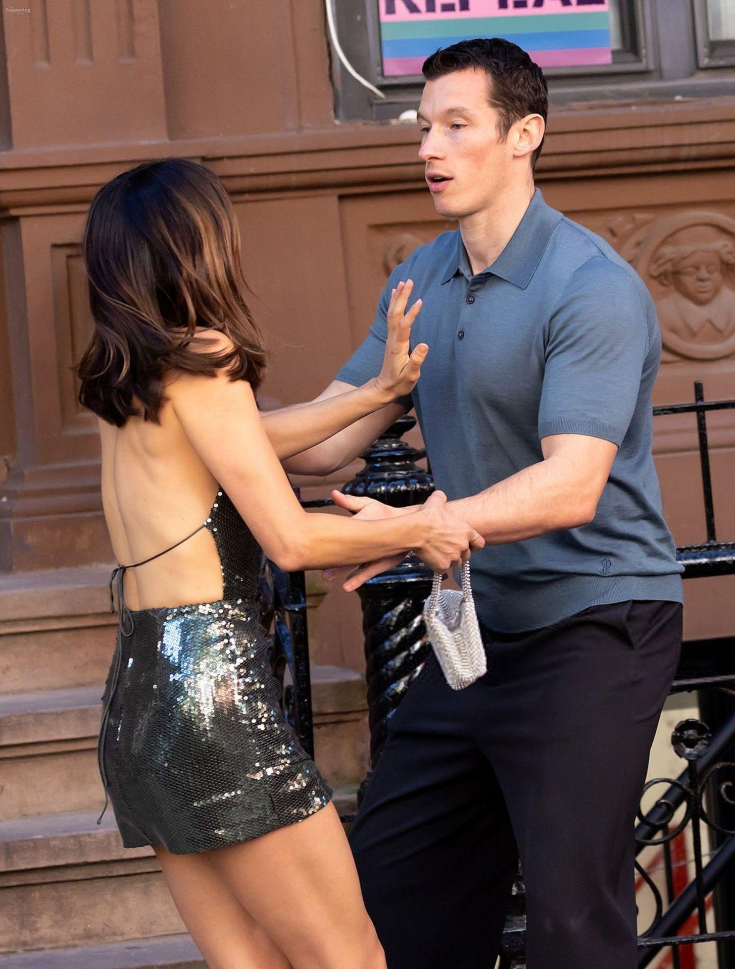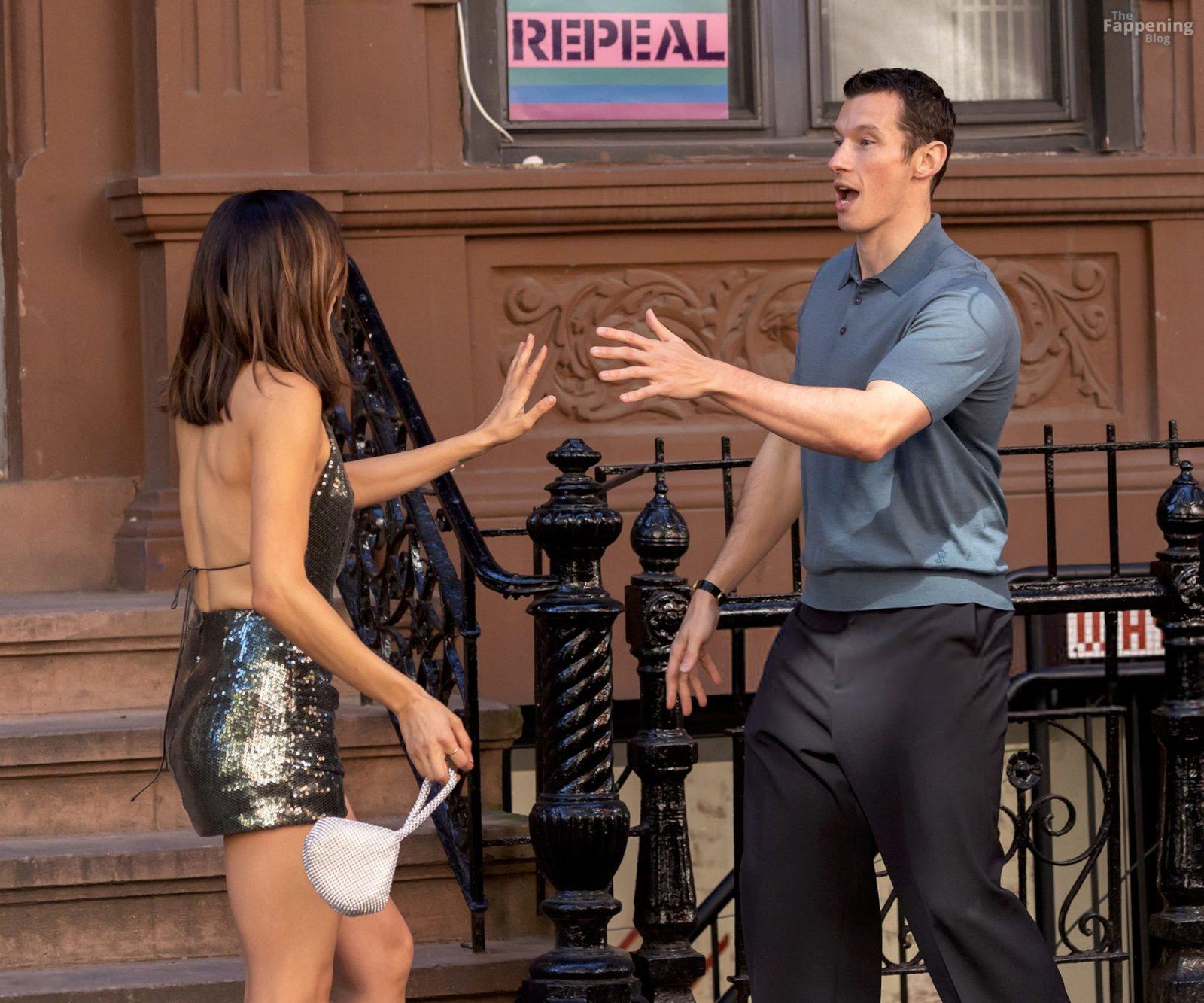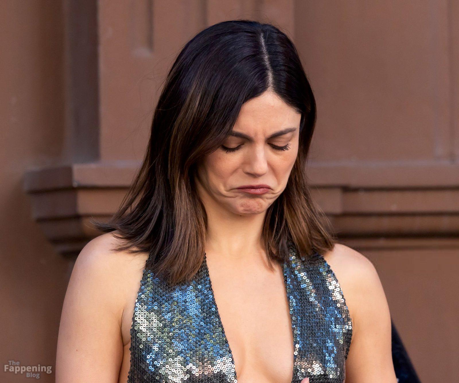 Monica Barbaro showed off her sexy body in a mini dress while filmin’ “One Night Only” on the NYC set in Downtown Manhattan.