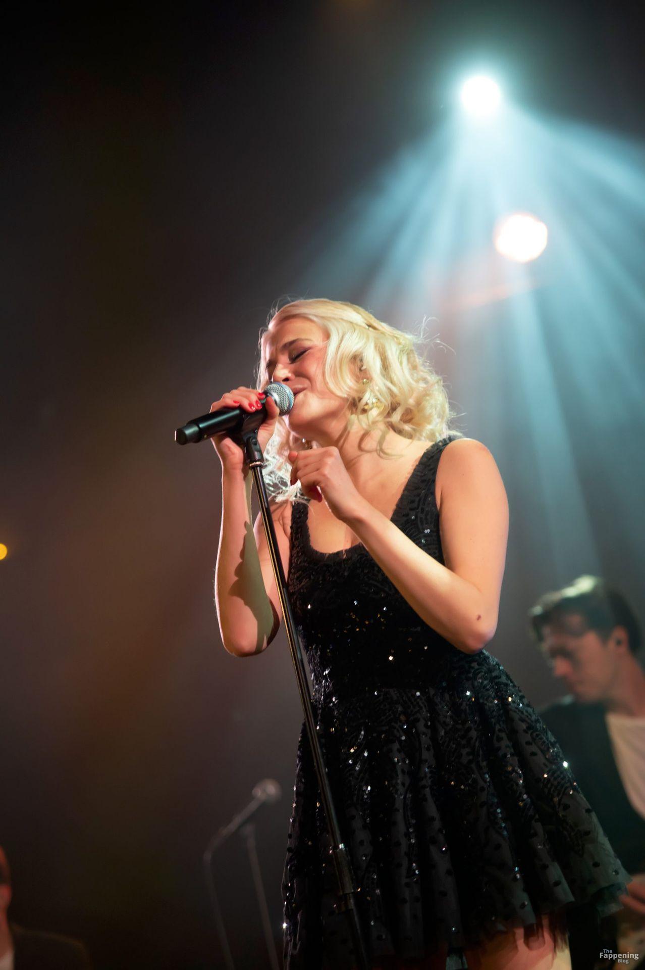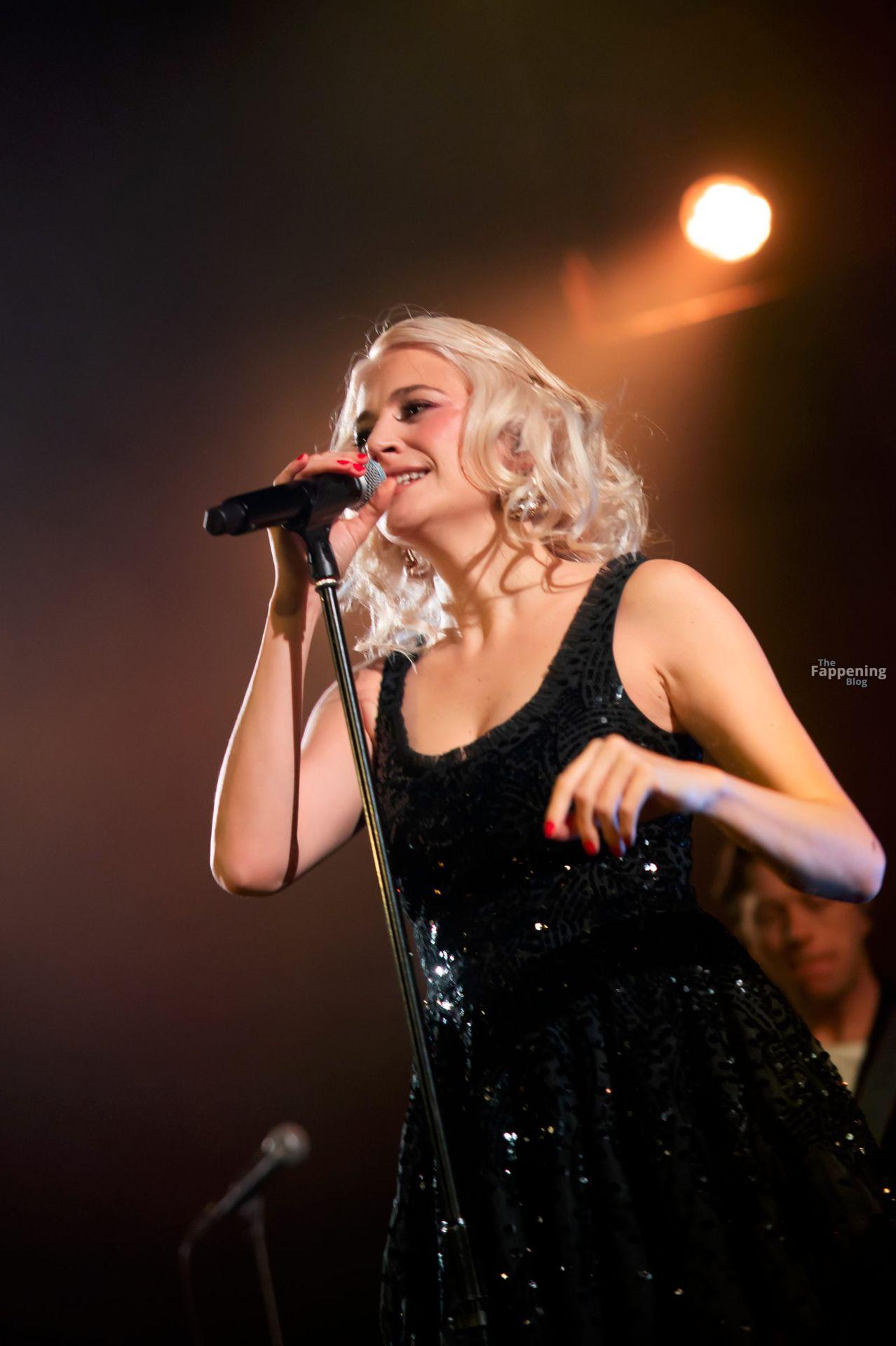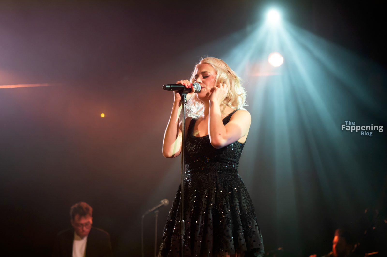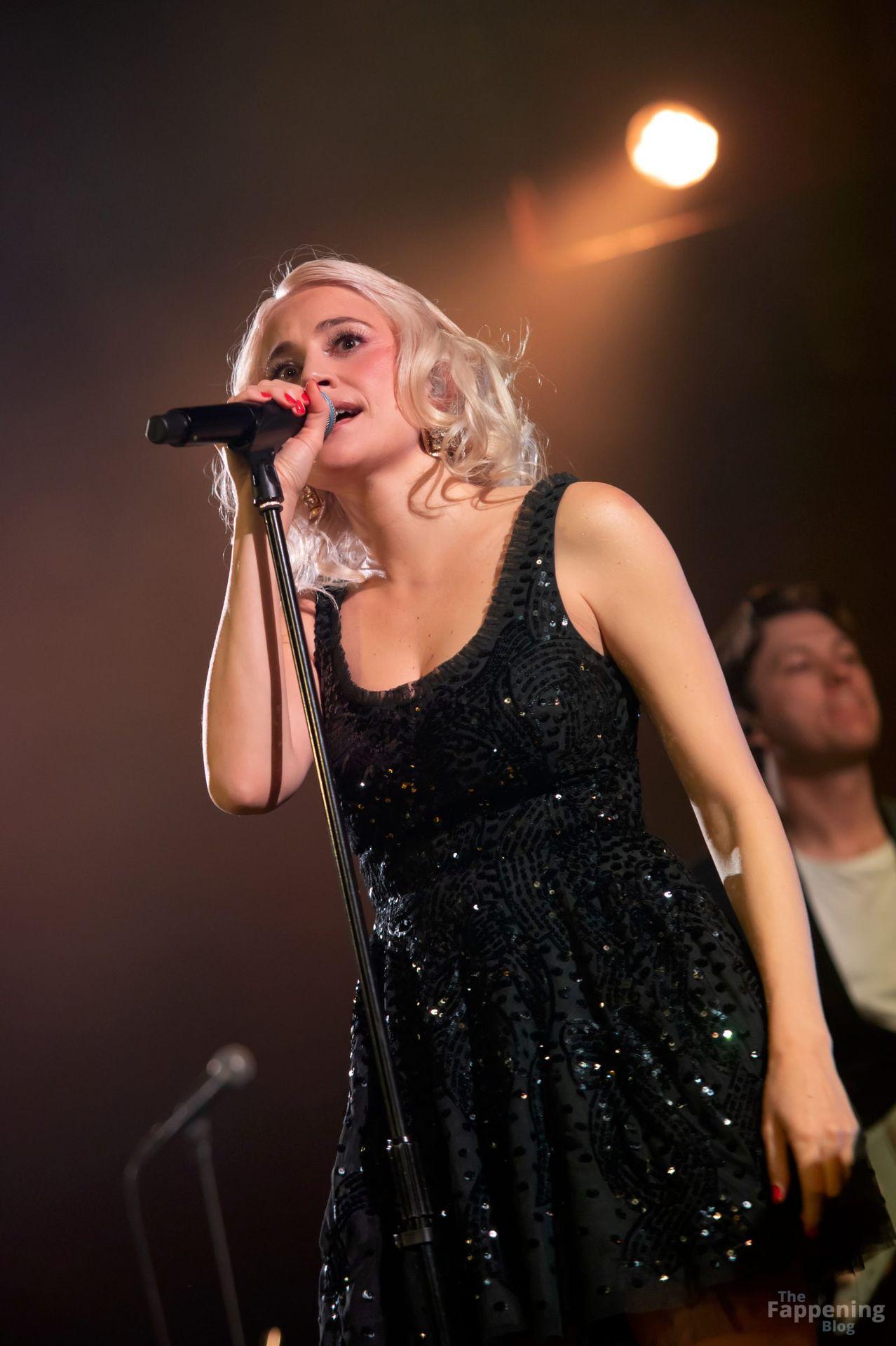 Pixie Lott was pictured at the London concert, wearin’ a black sequin mini, flauntin’ her legs and cleavage.