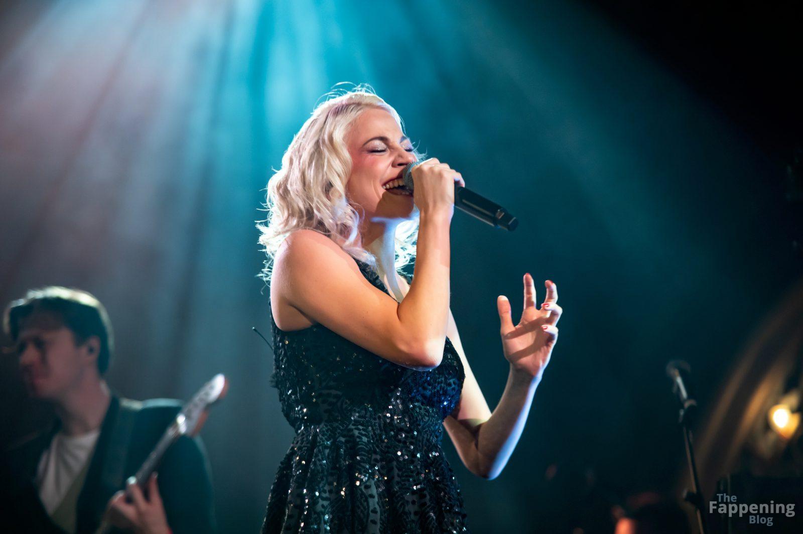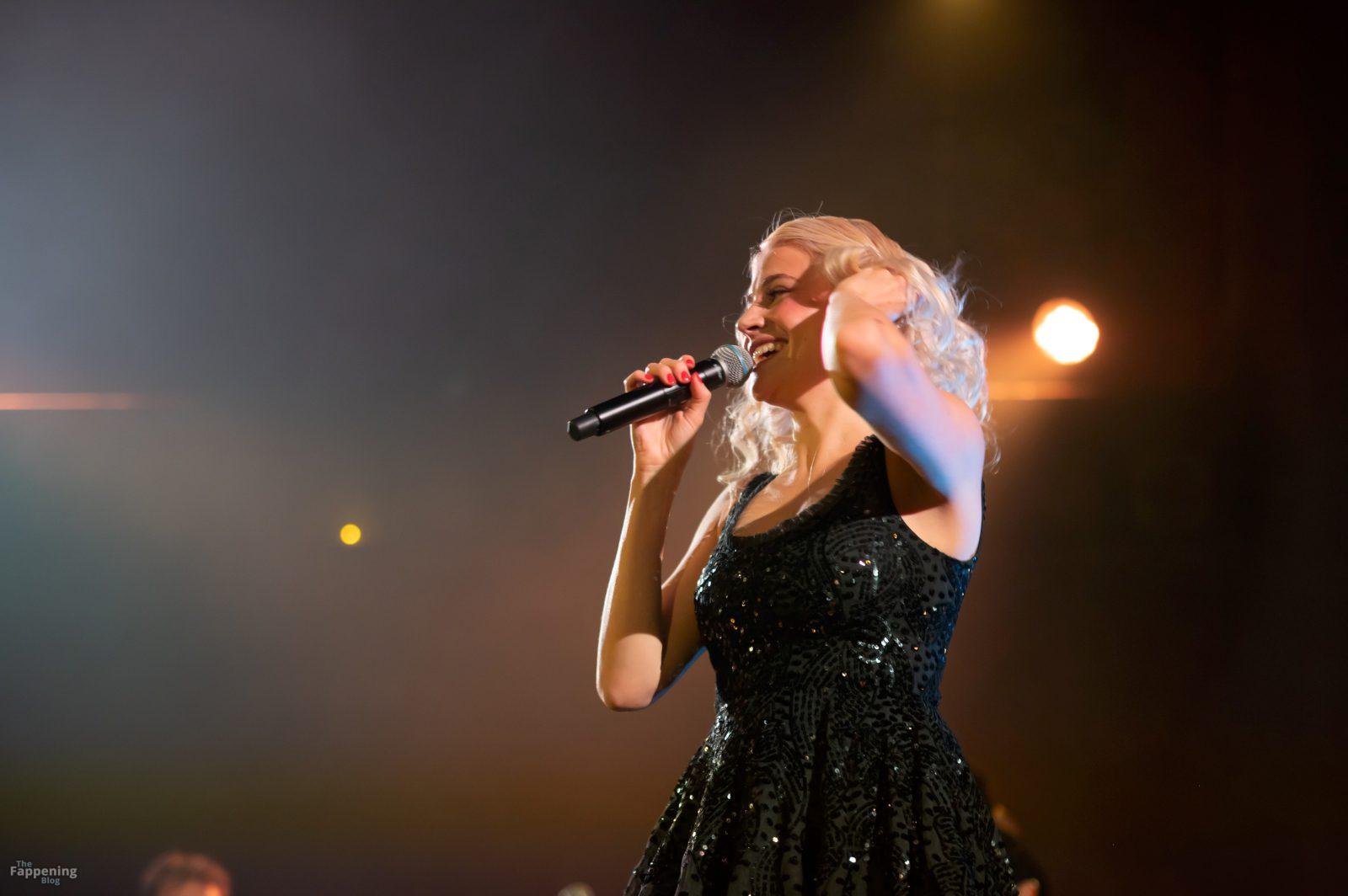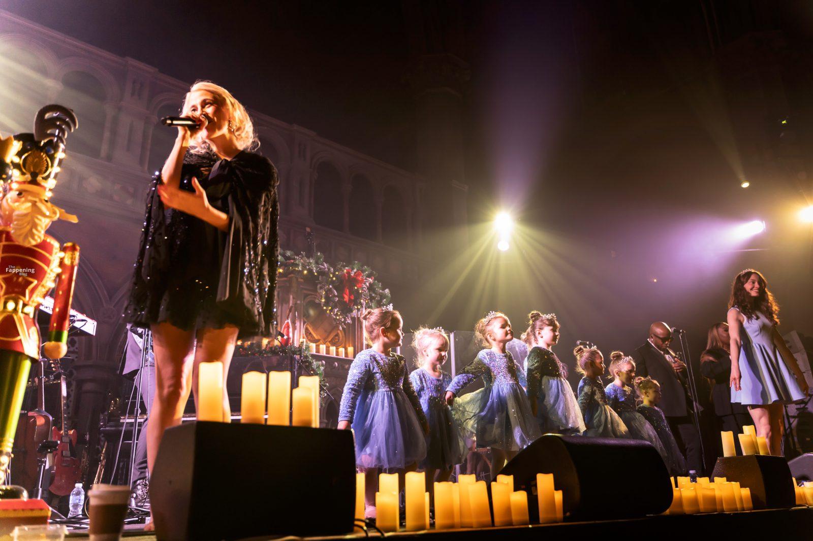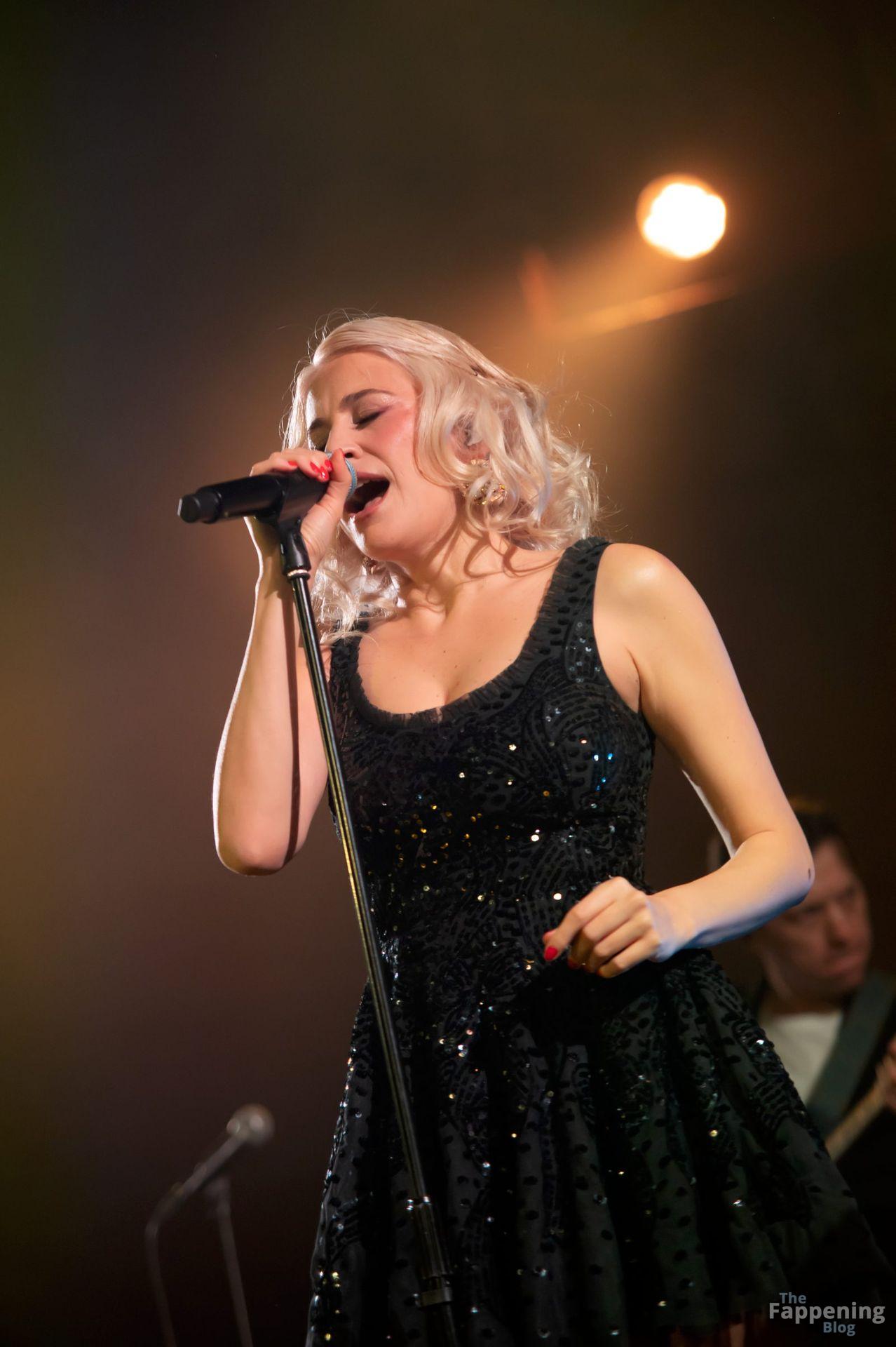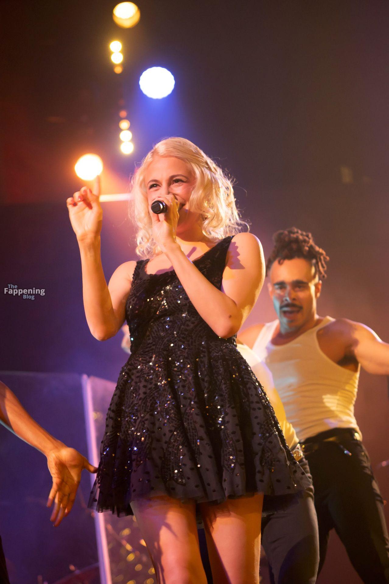 Pixie Lott was pictured at the London concert, wearin’ a black sequin mini, flauntin’ her legs and cleavage.