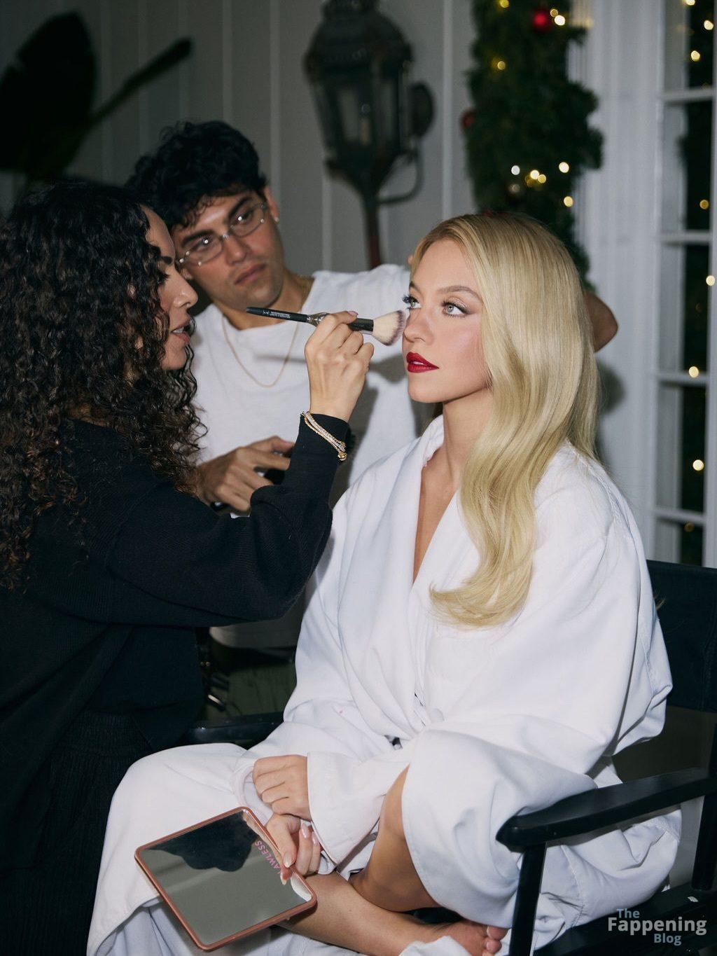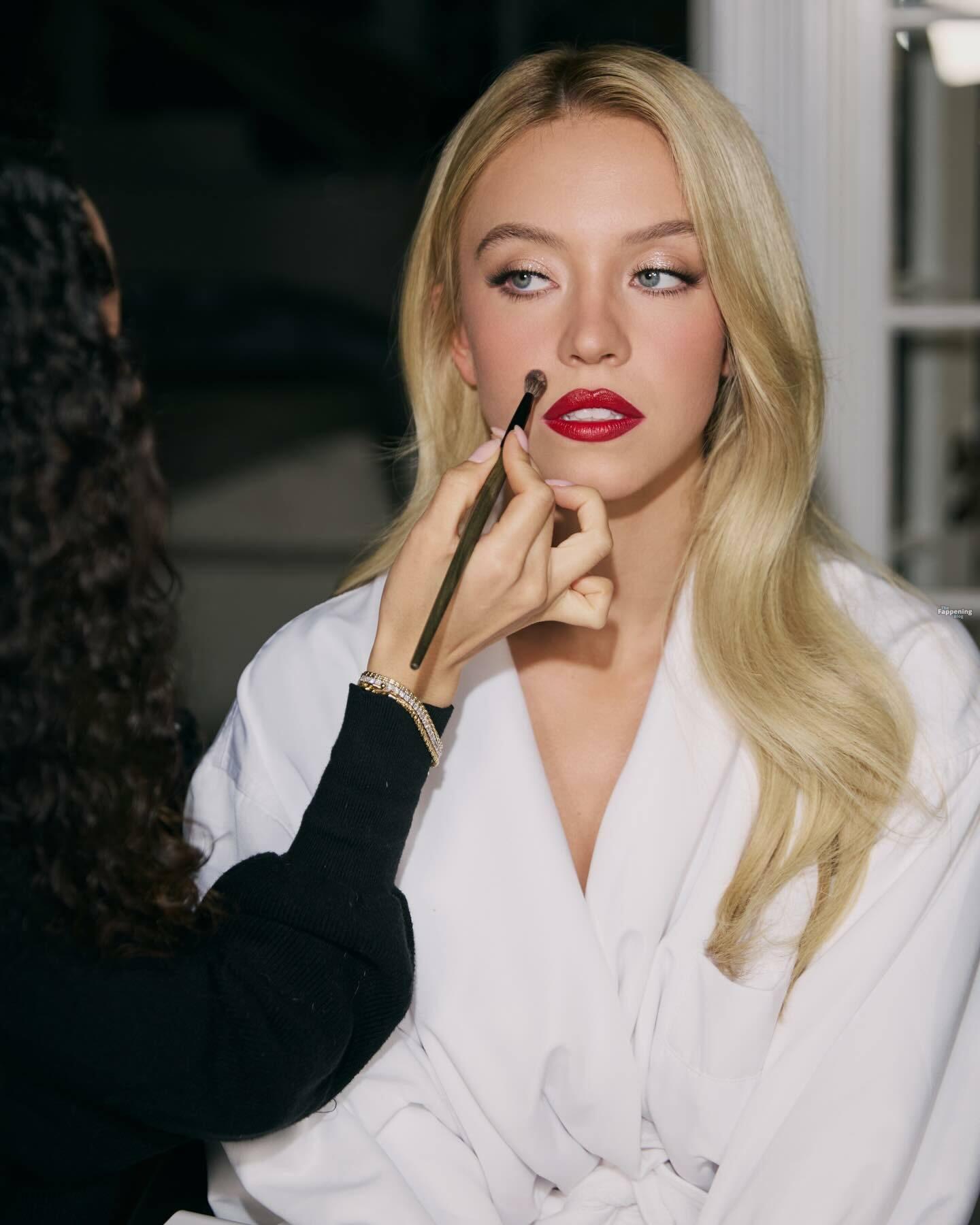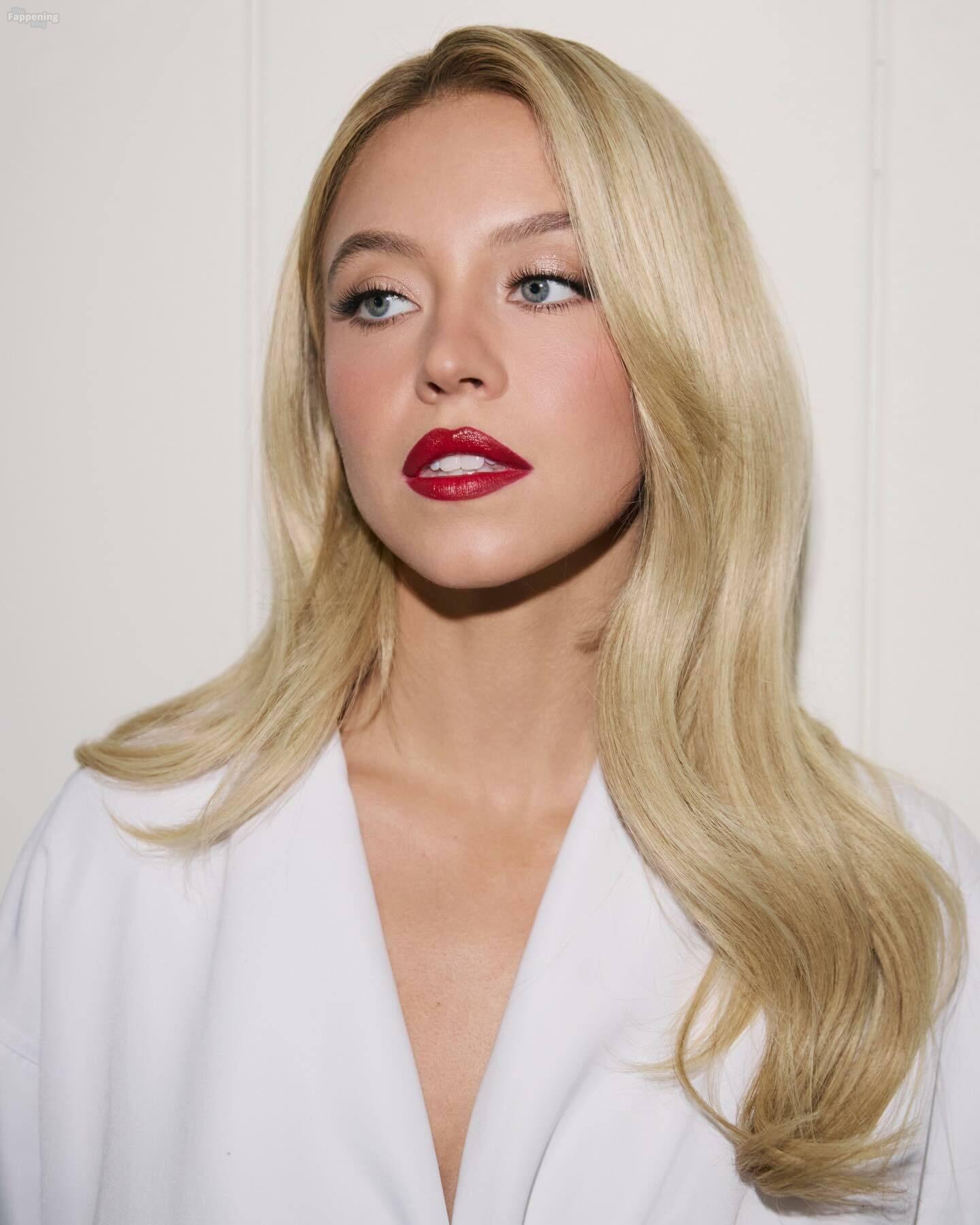 Sydney Sweeney displays her tits, posin’ in a plunging white dress for Sarah Krick’s shoot before the main event.